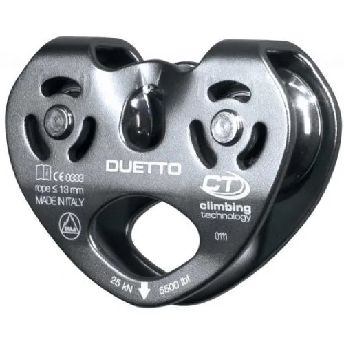 CT Climbing Technology Duetto è una carrucola tandem in lega leggera a flange fisse. Realizzata per teleferiche su corda o cavo, Duetto è particolarmente indicata per l’uso nell’ambito dei parchi avventura. Permette l’inserimento di tre moschettoni nell’occhiolo inferiore. Le pulegge in acciaio inox sono assemblate su quattro cuscinetti a sfera.