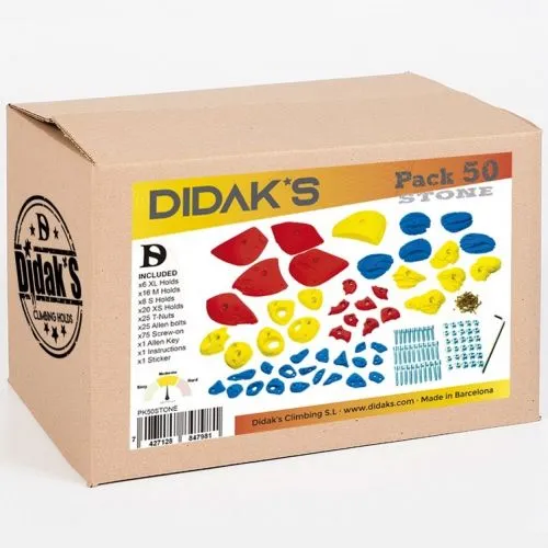 Didak’s PK Stone 50 è un set che comprende 50 prese da arrampicata di varie grandezze e difficoltà. Questo kit è particolarmente indicato per tutti coloro che hanno appena costruito il loro pannello a casa e vogliono iniziare a metterci un po’ di prese sopra.