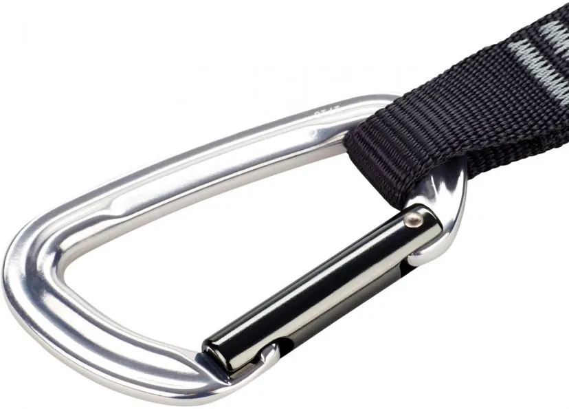 Express è robusto e costituito da una fettuccia in poliammide larga 17 mm e lunga 12 cm. I due moschettoni Montgrony sono in alluminio leggeri, grandi e resistenti.