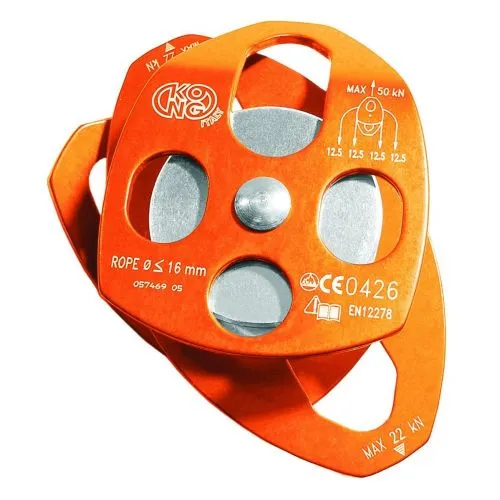 La carrucola doppia a flange mobili Kong Twin è realizzata in alluminio e dotata di cuscinetti a sfera ad alta efficienza (96%). Twin è destinata ai parchi avventura, lavori in quota e manovre di soccorso.