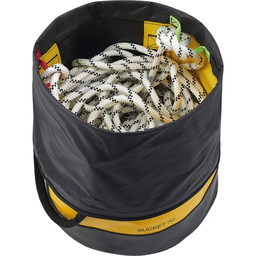 Petzl Bucket 30 è un sacco autoportante da lavori in quota e big wall che consente di riporre fino a 110 metri di corda da 11 mm di diametro.