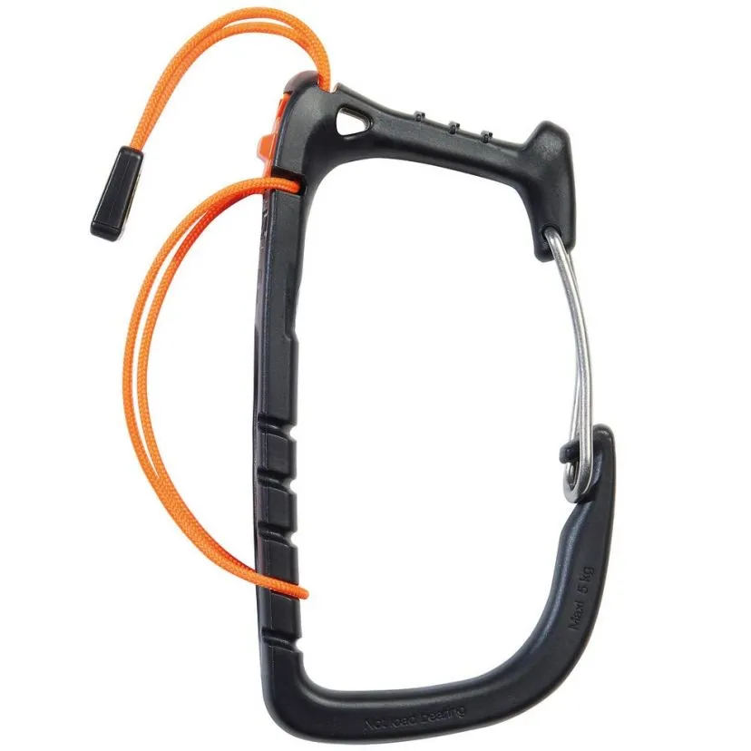 ATTENZIONE: NON E’ UN DPI. NON USARE PER ASSICURAZIONE. Il moschettone può sostenere solo il peso dell’attrezzatura (max 5 kg).